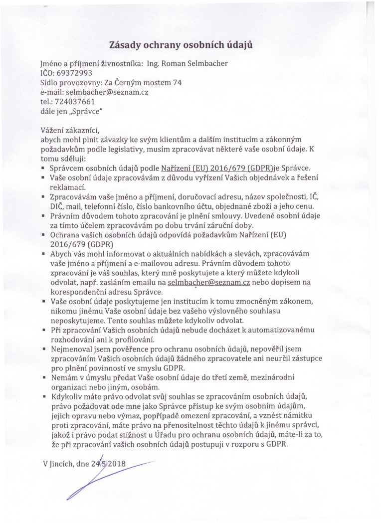 - Abych vás mohl informovat o aktuálních nabídkách a slevách, zpracovávám vaše jméno a příjmení a e-mailovou adresu. Právním důvodem tohoto zpracování je váš souhlas, který mně poskytujete a který můžete kdykoli odvolat, např. zasláním emailu na selmbacher@seznam.cz nebo dopisem na korespondenční adresu Správce.